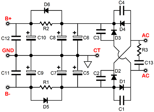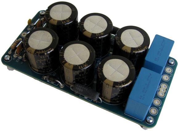 On this six by three inch, extra thick (0.094), 2oz-copper traces, USA-made PCB resides low-voltage, bipolar power supply, including the rectifiers and six power-supply reservoir capacitors, Nichicon audio-grade, 50V, 105°, 3.3kµF electrolytic capacitors. Resistor R3 and capacitor C13 shunt the power transformer secondary, so RFI can be converted into heat by the resistor. Each rectifier in the full-wave bridge is shunted by a ceramic capacitor, which helps prevent the generation of RFI. All the rectifiers are MUR410G devices, which are ultrafast types, with a 25nS recovery time, which were designed for use in switching power supplies, inverters and as free wheeling diodes. Each rail gets its own 6.8µF/300V polypropylene bypass capacitor.